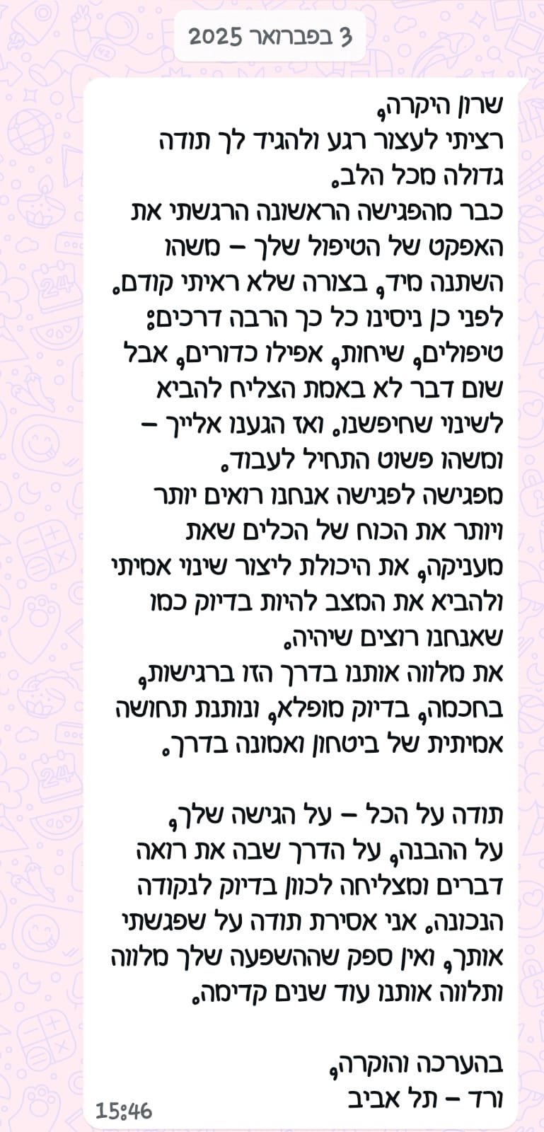 שילוב בין מקצועיות ואנושיות – טיפול המבוסס על ידע והכשרה מקצועית לצד חום, אמפתיה ויכולת אמיתית להקשיב ולהכיל.