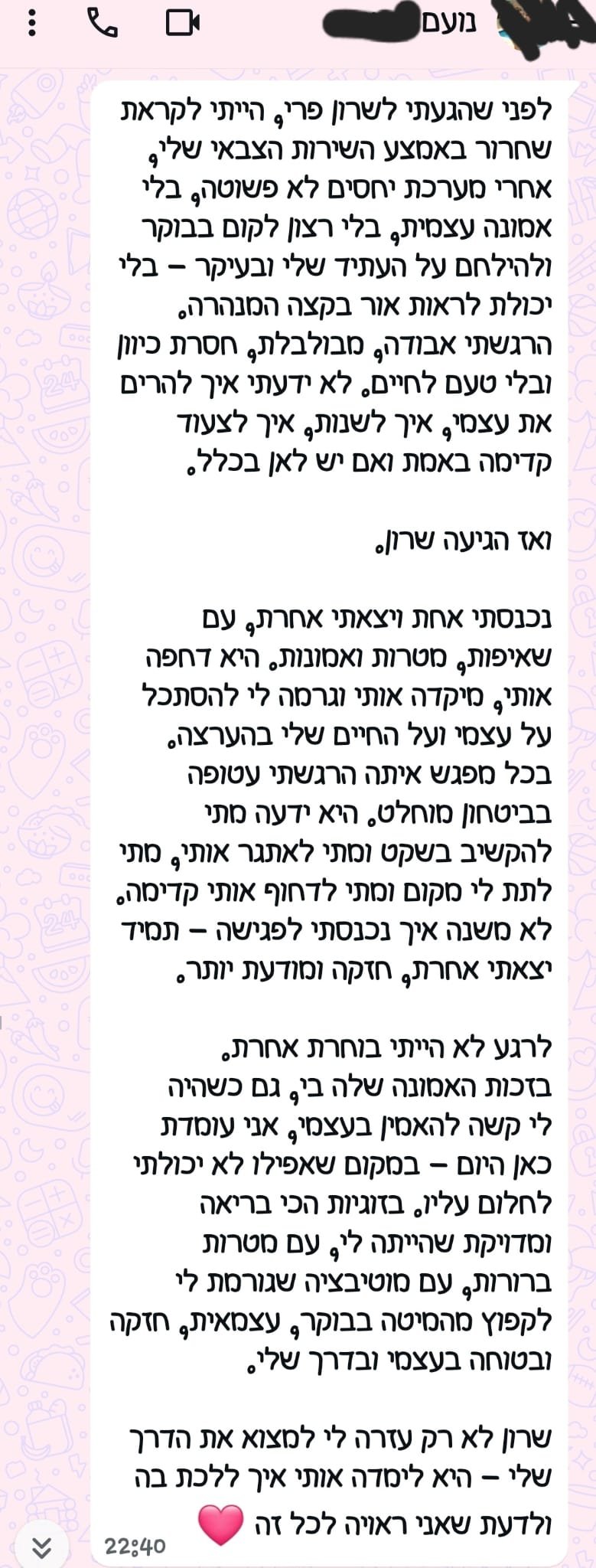 החזון שלי, הוא לאפשר לכל אדם החווה קושי או כאב, לגלות שבתוך כל משבר מסתתרת הזדמנות – הזדמנות לצמיחה, לשינוי ולהתחלה חדשה
